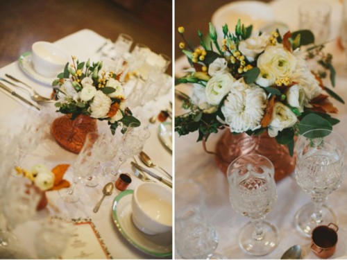 Today’s a lovely styled shoot is from a bunch of talented Italian artists! They were inspired by Italy in the Fifties. At that time lots of families lived in farmhouses and the barnyard was the meeting point where people got together in the evening after working in the fields. They used that as inspiration along with fall colors + copper – which was a typical element in the farmhouse. I love the bride’s and groom’s looks: mid-calf fluffy skirt of the wedding dress, chic burgundy stole, golden bow tie and gorgeous hat. The bouquet of white chrysanthemums, weld red berries, beech leaves and ivy is perfect for fall weddings. Such a lovely rustic wedding inspiration, isn’t it?